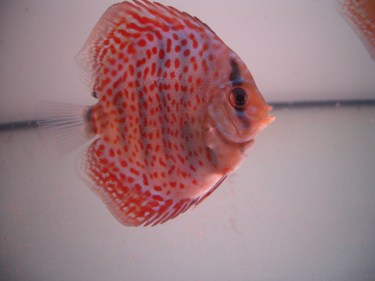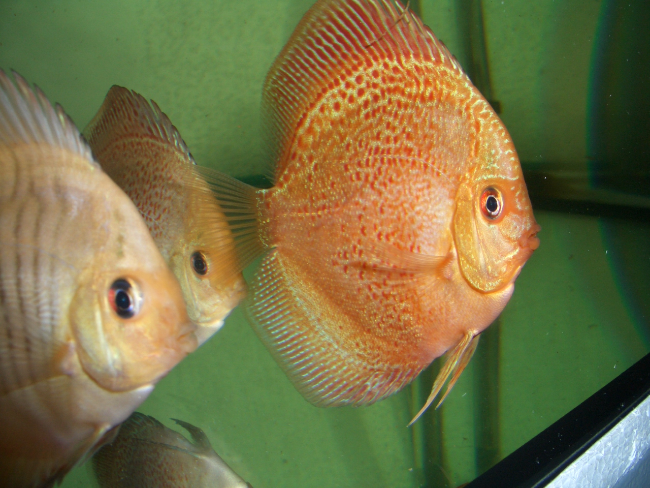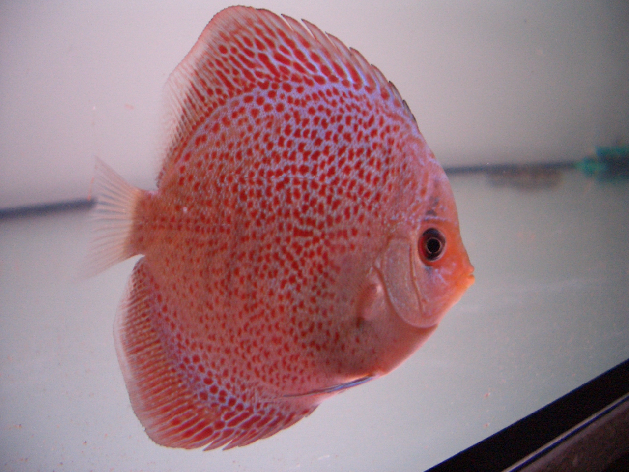 При этом дискус кушает со всеми и какает хорошо, плавники не прижаты, в угол не забивается. Правда в росте отстал от своих сородичей. Параметры воды в норме.