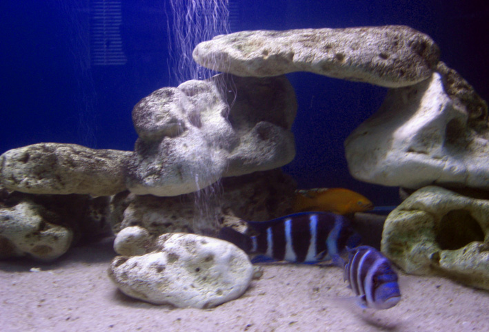 В 13-00, начал сливать воду, технология проста и многими опробирована, длинный шланг по которому вода из старой аквы переехала в ванну , бидоны, выварки. Когда осталось литров 100 отловил рыбу и поместил в отсадничек литров на 30 в котором работал внутренний фильтр и нагреватель. После рыбалки слил оставшиеся 100 литров. Выбрал грунт предварительно слегка промыв в остатках аквариумной воды. На все про все - 2часа. Затем подъехали друзья, прздник все таки, и с шутками и прибаутками вспоминая службу и старшину, который любил совмещать пространство и время, поменяли аквасы, блин, тяжело. После был уложен грунт, конечно старого не хватало и было докуплено нового 15 кг., который надо было поискать еще пол города объездил, но нашел именно такой как нужно. Прямо на песок был установлен грот из камней привезенных с Черного моря. Естественно перед укладкой грунта были проведены воздуховоды для распылителей, установлены всасывающие патрубки фильтра, который был вымыт, заменен цеолит, добавлен Matrix в объеме 1 литр и пуриген 150мл. Все легкая работа закончена. Затем уложив на песок тазик. начал заливать воду, её оказалось литров 330, а так как банку планирую заливать до 700 литров, то вопрос где брать остальную? Правильно из-под крана. Сегодня добавил отстоявшейся воды литров 150. Да, рыбу выпустил вчера. Завтра планирую добавить еще литров 150 или чуть меньше и таким образом до понедельника набрать полный объем. рыба чувствует себя нормально, с опаской осваивает новые обемы, отплывут от грота немного осмотрятся и назад. При переезде замерил самца 21-22см., так что рост с 18 см налицо и это за три месяца. В 18-30 все было закончено и