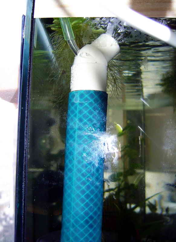 Выхлопное колено установлено на глубине 2-3 см под поверхностью- нормальное расстояние и чтобы течение на поверхности создать, и чтобы пузырьки мелкие по акве летали. Вполне приличная рябь тоже есть.