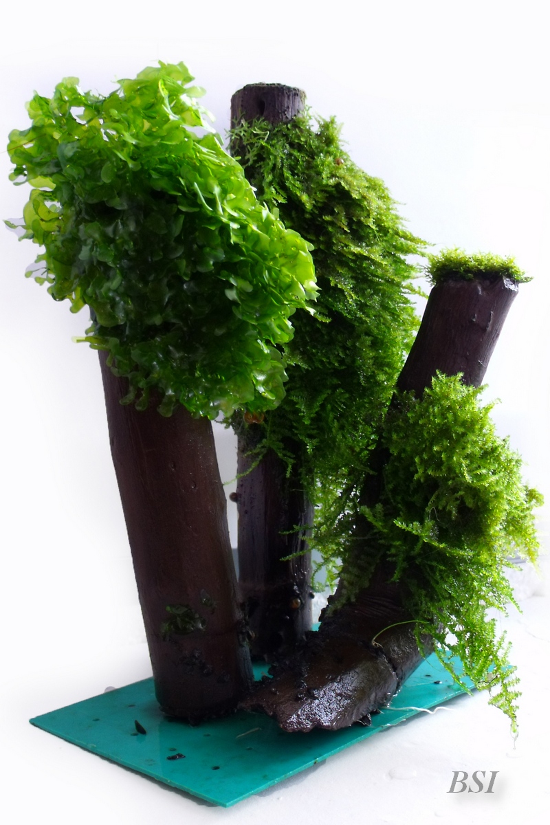 Здесь наступает ключевой момент в формировании композиции. В предидущей версии "Леса", деревья стояли в левой части. Это было ошибочно, т.к. в силу особенности крышки, правая четверть аквариума освещается меньше, а мдля мхов - самое ТО!. Потому деревья перекочевали в правый угол.