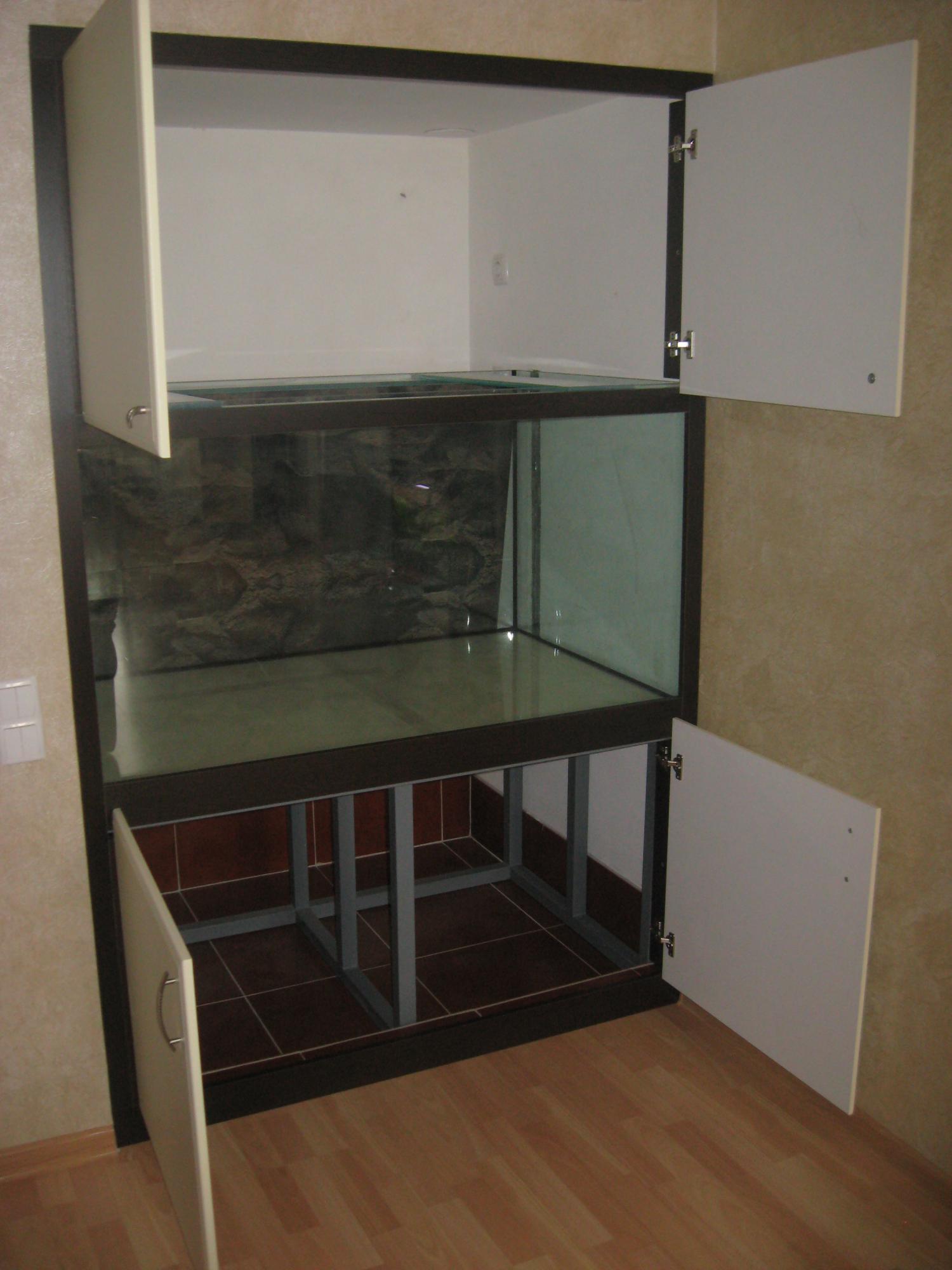 Имеется ниша выделенная специально для аквариума, вот она Скрытый текст её размеры в см. 132 х 110 х 200 (Д х Ш х В) с выводами холодной воды, канализации и электричества (розетка и свет под двойной выключатель). Тумба и крышка как таковые не нужны, поскольку видимая область только спереди, надо что-то придумать чтоб эстетически скрыть металлический каркас-тумбу и освещение, при этом чтоб был полноценный доступ в обслуживании.