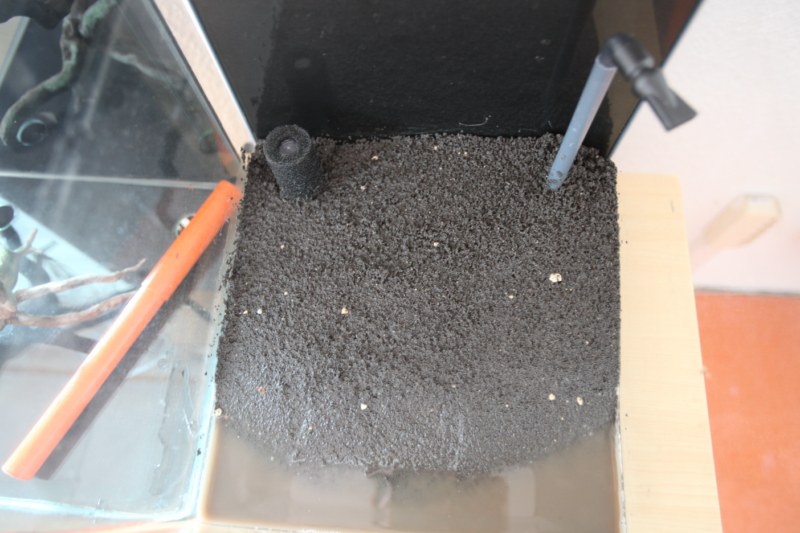 и вот такой вид сбоку получается. здесь питательный слой уже с примесью амазонии, т.к. уже побывал в аквариуме до того, как я начал городить всё это. поэтому я его снимал и естественно все немного вперемешку.