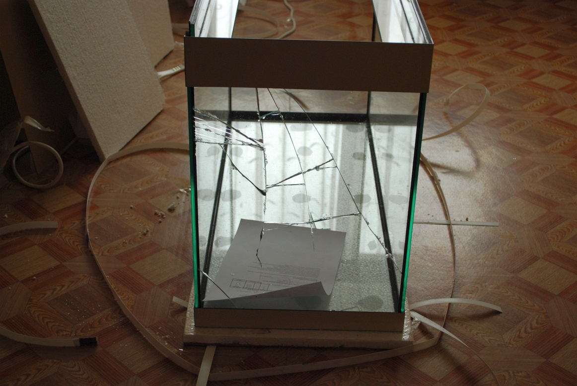 Вот собственно говоря, как выглядит полученный аквариум. Я также сделал фото пенопласта и листа ДВП, которые соприкасались с битой стороной. Они идеальны - ни вмятины ни царапины.