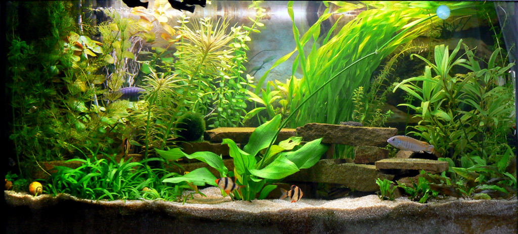 Из живности - живут малавийские цихлиды, я понимаю, что это не совсем правильно, но растения они практически не трогают.