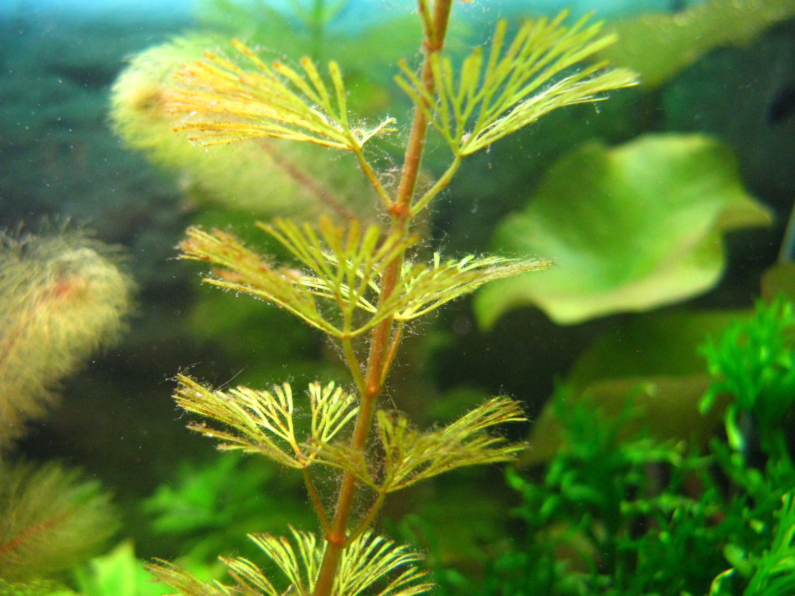 За это время провел ряд усиленных просифониваний грунта, (про замену фильтра вроде уже докладывал?), три-четыре раза применял АРИ Акку Клеар (коагулянт) , включил опять бражку, умеренно применяю сайдекс, с перерывами. Стало получше. Вода стала более прозрачная, взвеси в воде заметно меньше, но еще есть. Больше беспокоит давняя проблема с некими водорослявыми обрастаниями растений, например на фото кабомбы (нитчатка?!) и отвратительное состояние нижних листов у людвигии. Собственно, похожая ситуация и со старыми листами эхинодорусов, хотя есть еще версия что их портят некоторые кольчужные сомы, присутствующие в аквариуме. ВОбщем, может быть комуто пригодиться мой опыт, также буду благодарен за любые комментарии!