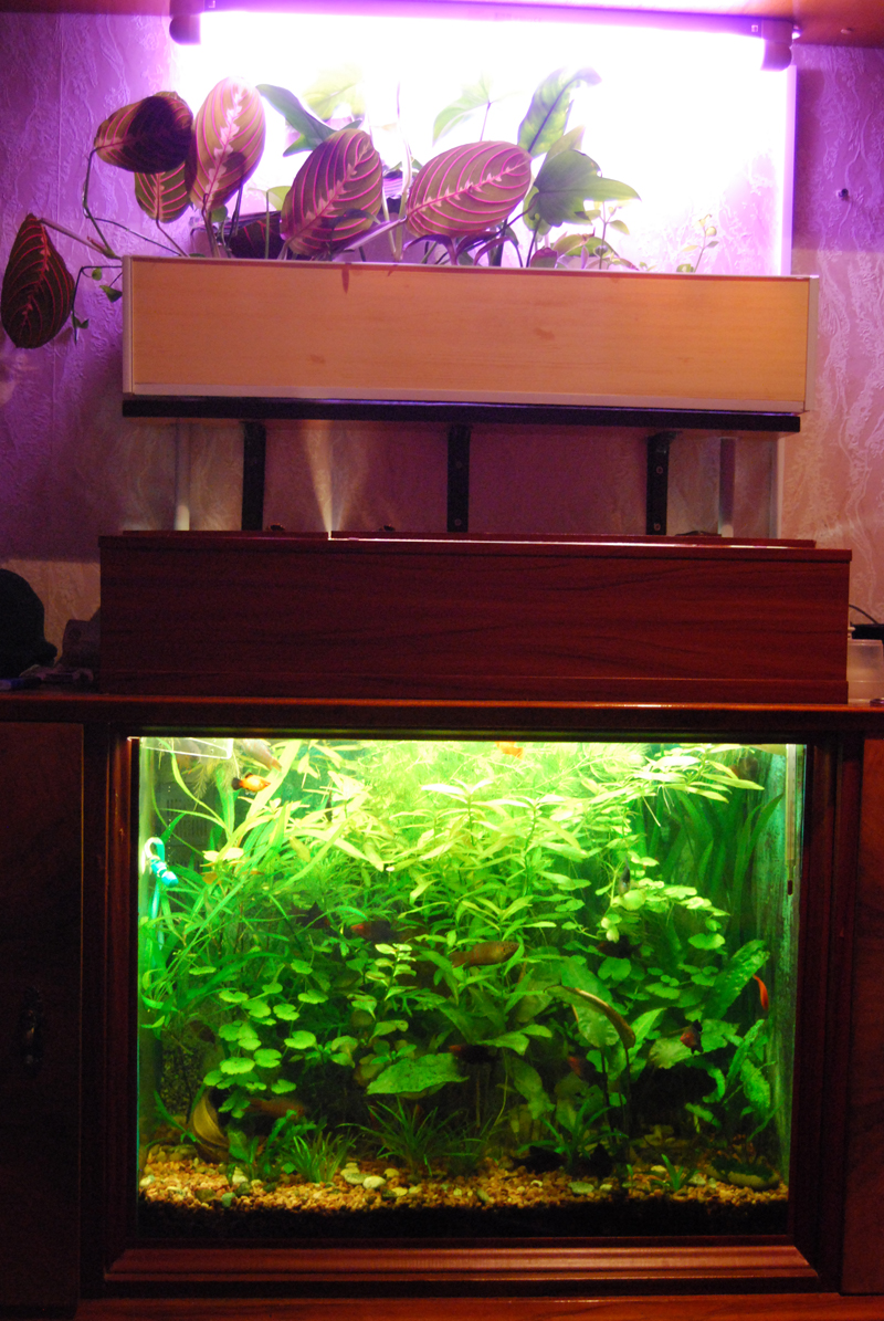освещенном коридоре. Пробовали и с "козырьком", но тогда почти не остается визуально места для растений. От верхнего края самой коробки фитофильтра до полки на которой закреплена лампа 28 см., не густо...  Насчет гидропоники - это мечта...красоту фитостен на словах передать сложно...А фитофильтр от необходимости увеличить колличество естественного фильтрующего материала, увеличение "массы" полезных бактерий...борода замучила в аквариуме...Обычно, насколько я знаю, фитофильтр начинает давать результаты через три-четыре месяца.Увеличивается корневая система растений и уж тогда они "по полной" начинают