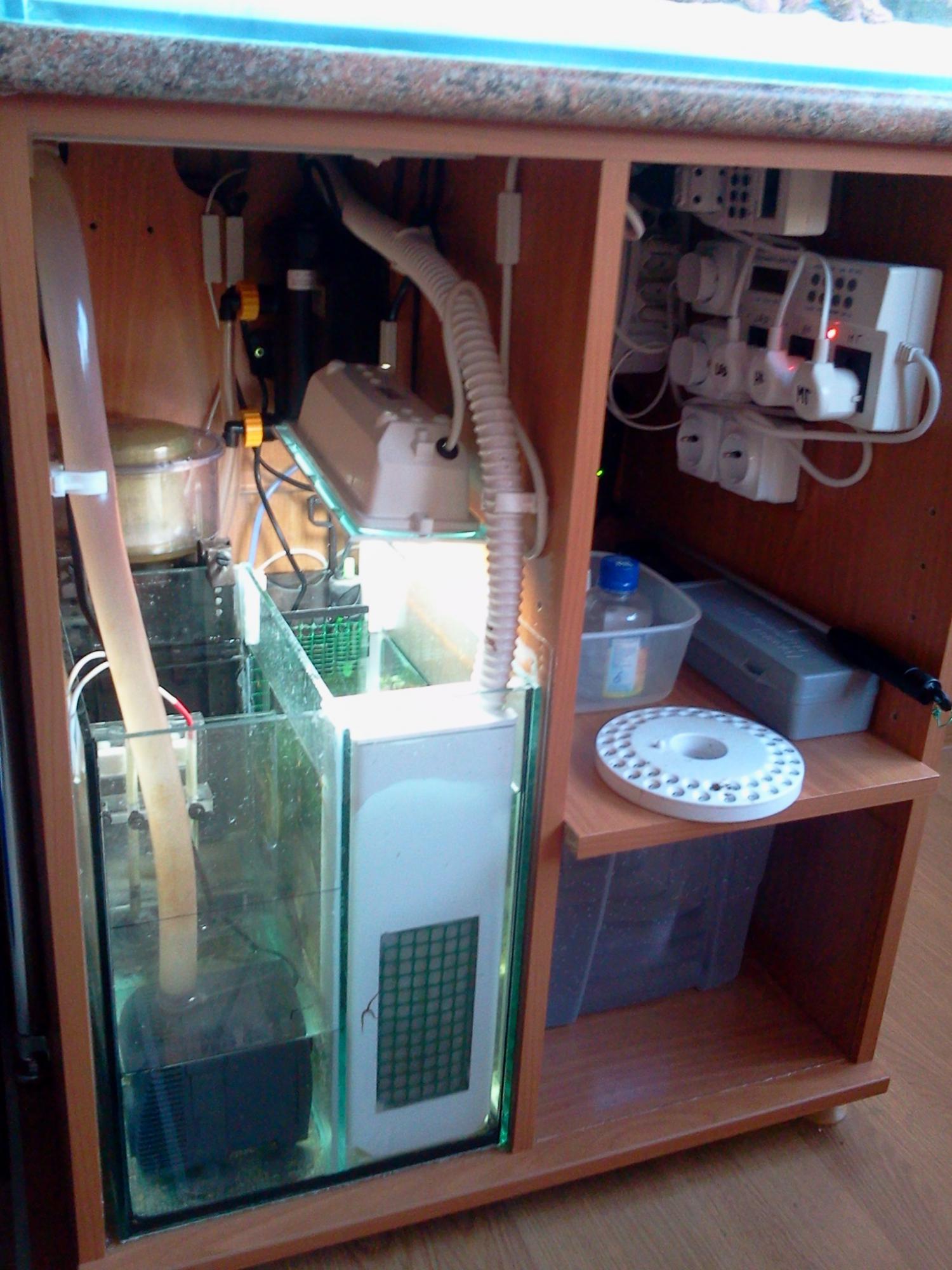 В октябре-ноябре поставлены по заказу аквариум и тумба. В декабре закончены обдумывания сампа и на китайской помпе отработан перелив. В феврале закончено самодельничание со светильником. В марте-апреле собрано оборудование, электрика и автоматика. 23 апреля, на пасху, засолена вода. 29 апреля собран риф. Это и есть фактическая дата воплощения моих фантазий и желаний.