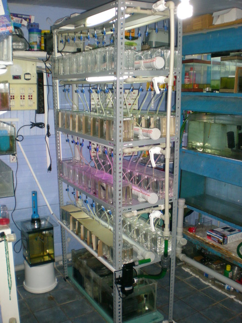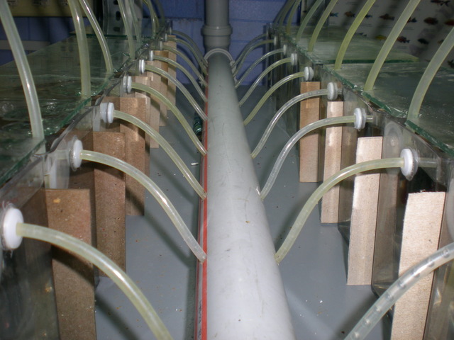 Похоже все таки на западе делают внизу САМП и разводка водички в каждую банку, банки пластмассовые, в каждой сделано сливное отверстие (тем или иным образом), на ближнем фото вообще сбоку просто сделано отверстие для слива, потом по желобу где стоят банки в черную трубу и в САМП. Первоисточник форум http://www.bettas4all.nl