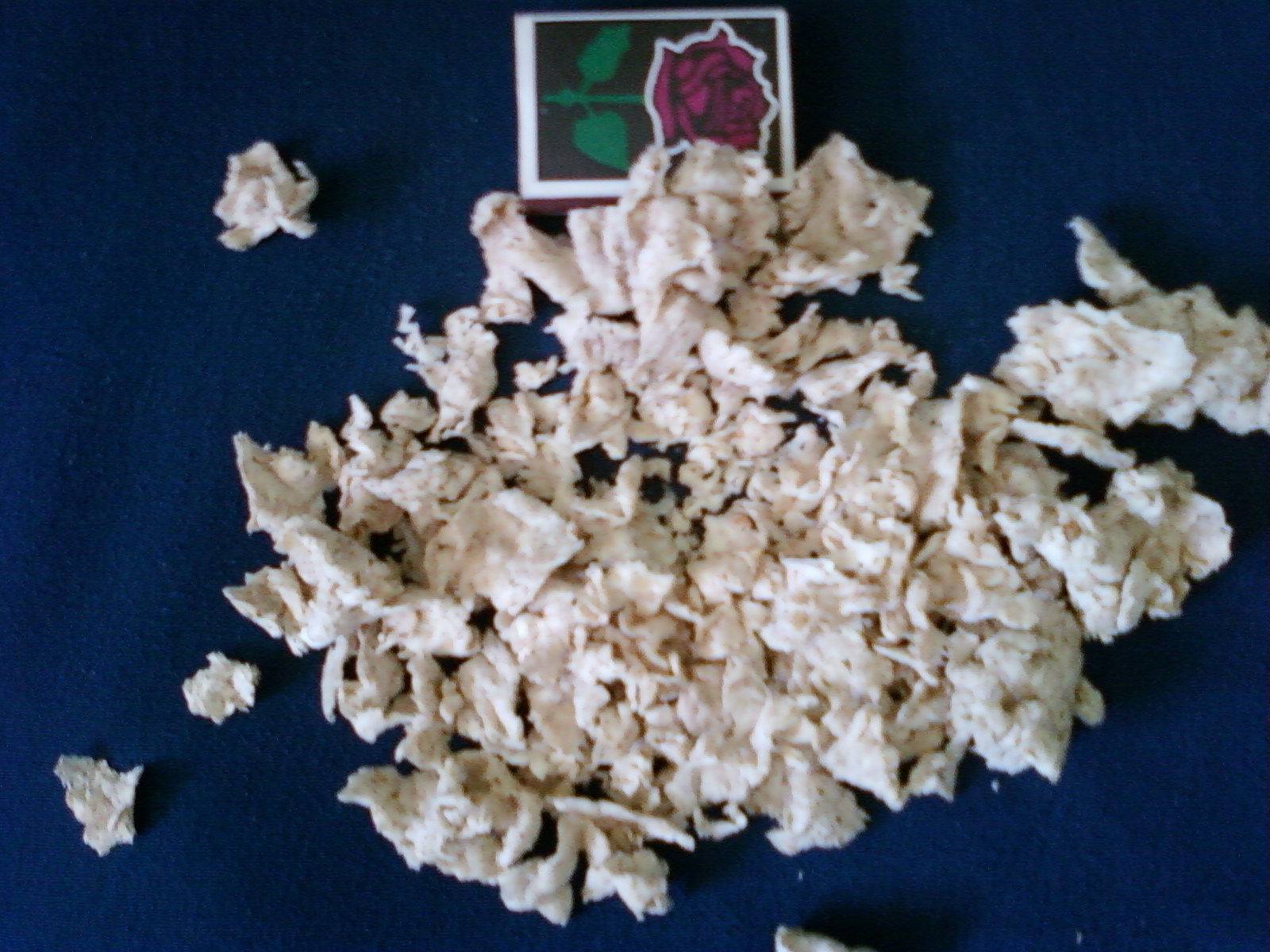 Как-то в одном из магазинов, я «споткнулся» о стоящий в углу целлофановый мешок с какими-то хлопьями, на котором было написано «корм для собак». После нескольких минут « словесных пыток» молодой и бестолковой продавщицы, я выяснил что данный корм состоит из хлопьев растительного происхождения, добавляется в корм собакам, преимущество данного корма в том что его не надо варить, при попадании даже в холодную воду (бульон) он быстро размокает, кроме того покупателей прельщает цена 12грн за мешок, кто производит она не знает, спрашивайте хозяйку, которой сейчас в магазине нет. На мешке не было никаких опознавательных знаков, ни производителя товаров, ни веса, то есть вообще ничего. Подумав немного, решил я приобрети данный шедевр, и попробовать в качестве растительного корма для рыб. Первым делом, после покупки мешка, решил его взвесить, вес 3 кг (4грн за кг, совсем не плохо, исходя из цены других рыбных кормов), после попробовал немного кинуть рыбам, в качестве подопытных кроликов выступили моллинезии и золотые рыбки. Корм рыбам понравился и процесс пошел.