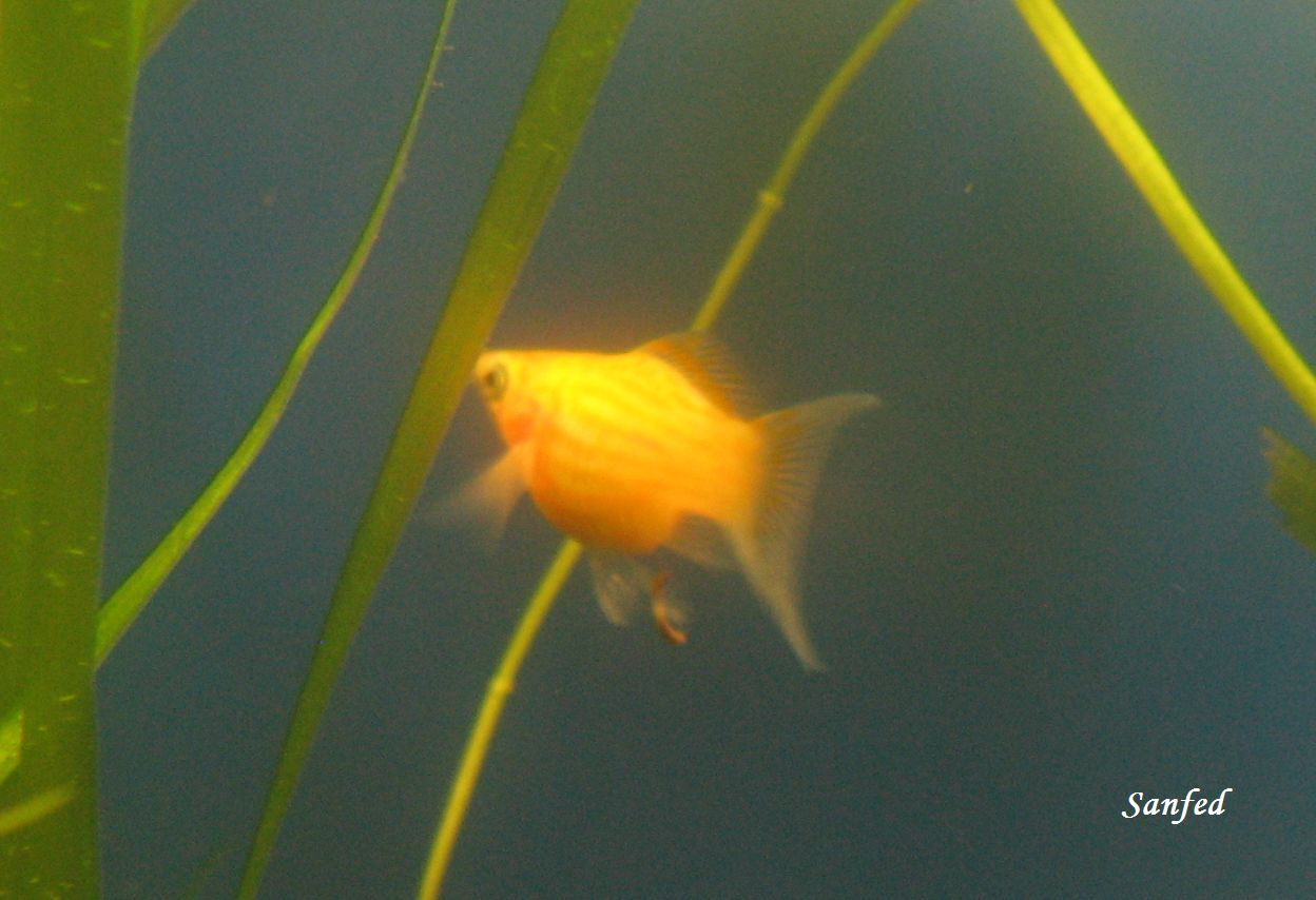 Меченосець "ананасовий"(молодь,вік 4 міс.),в результаті схрещування-получилась вилочна форма,починають набирати колір: