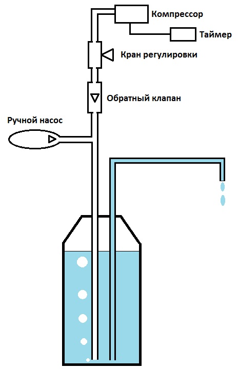 Планировал поставить перистальтический насос, но это уже не бюджетный вариант, пока отложил. Сделал с аквариумным компрессором.