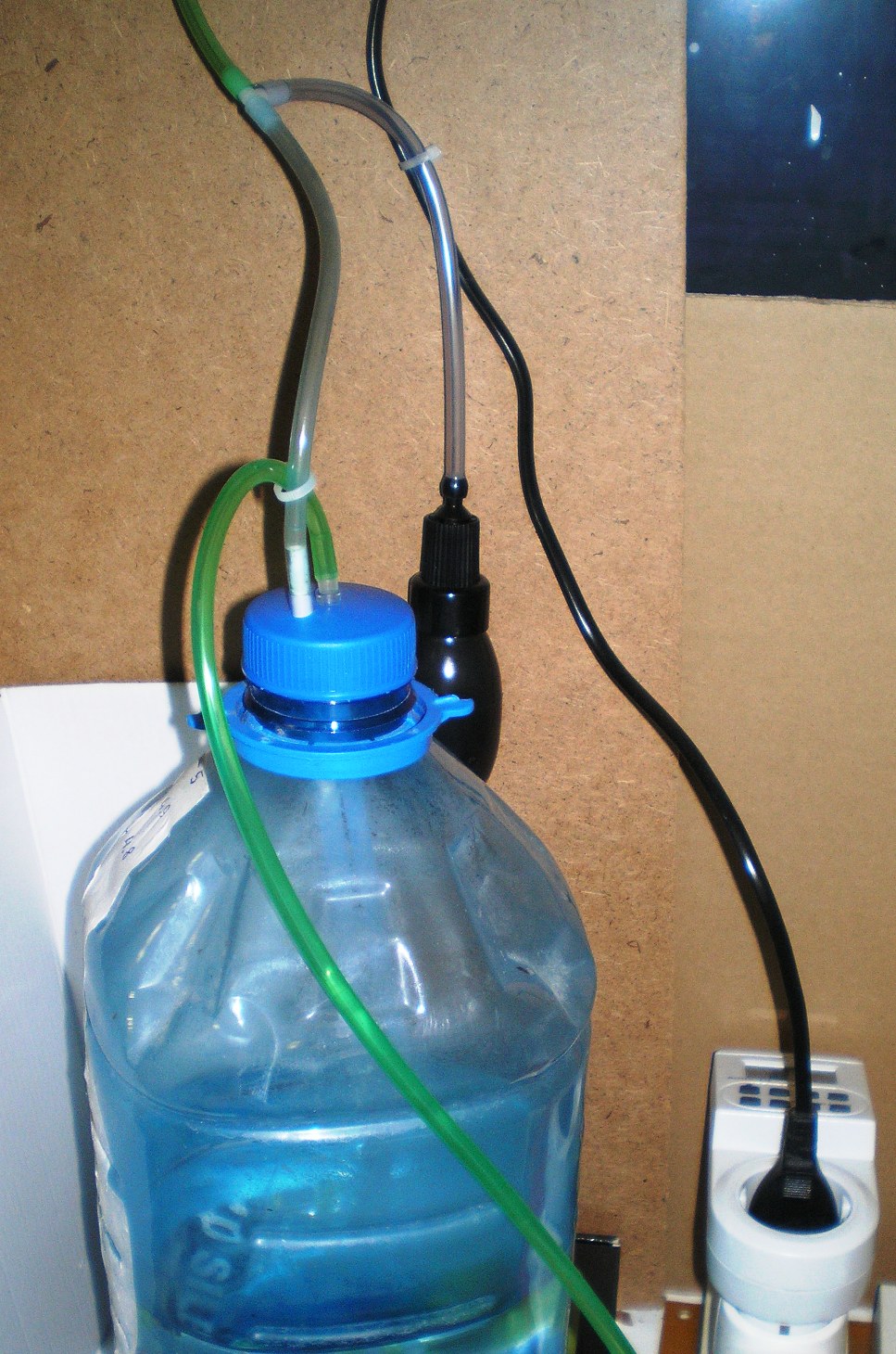 Чтобы не портить вид на баночку, бутылку для долива (ПЭТ 2 литра) повесил на стене подальше в не бросающемся в глаза месте, в 2 метрах от аквариума на высоте чуть большей верхней кромки аквариума и протянул вдоль плинтуса тонкий компрессорный шланг. Отрегулировал на 1 каплю за 2 сек.