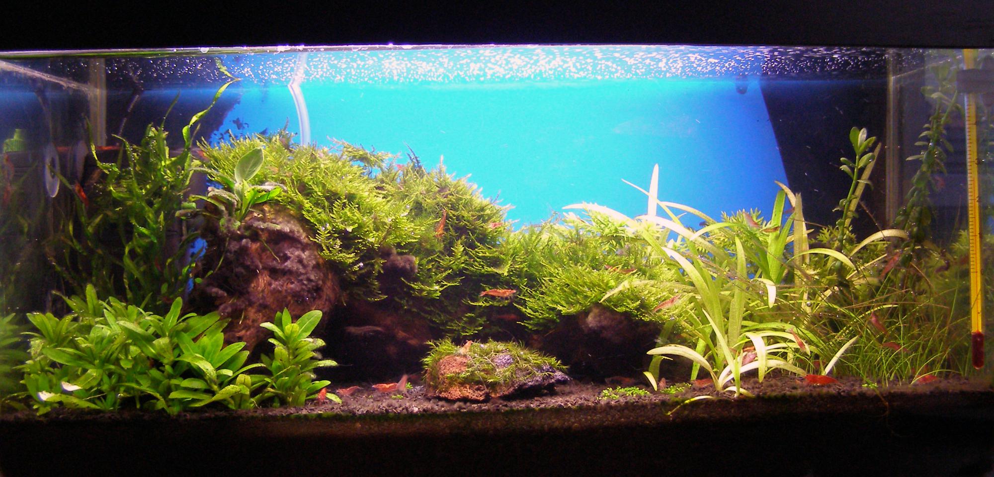Думаю, проблема в отсутствии нормальной сифонки, доселе редкой промывки фильтра (промывался 1 раз в неделю, когда делал подмену, Tetratec IN 300, был постоянно забит), бестолкового кормления креветок и в повышенной температуре (+28)