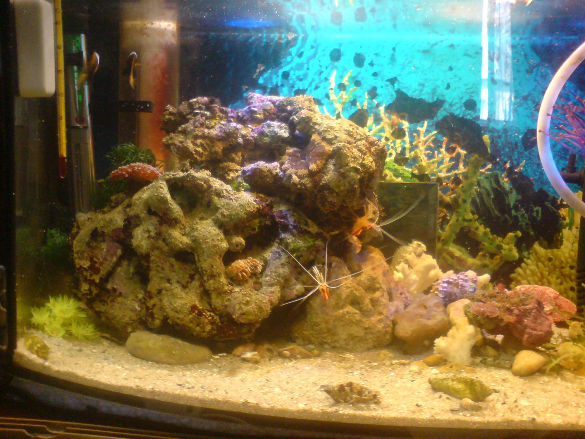Так у вас и есть проблемы!!! Куча пласмасок, а то, что живое, выглядет поганенько. Зонтики закрыты, эуфилия повисшая, щупальцы короткие. Течения нет, бактериальная пленка на поверхности, камни в налете, мертвые скелеты кораллов в акве... Так, о хорошем.... Блин, и сказать то нечего... Ах да - рыбки с креветками еще не сдохли... Грусно...
