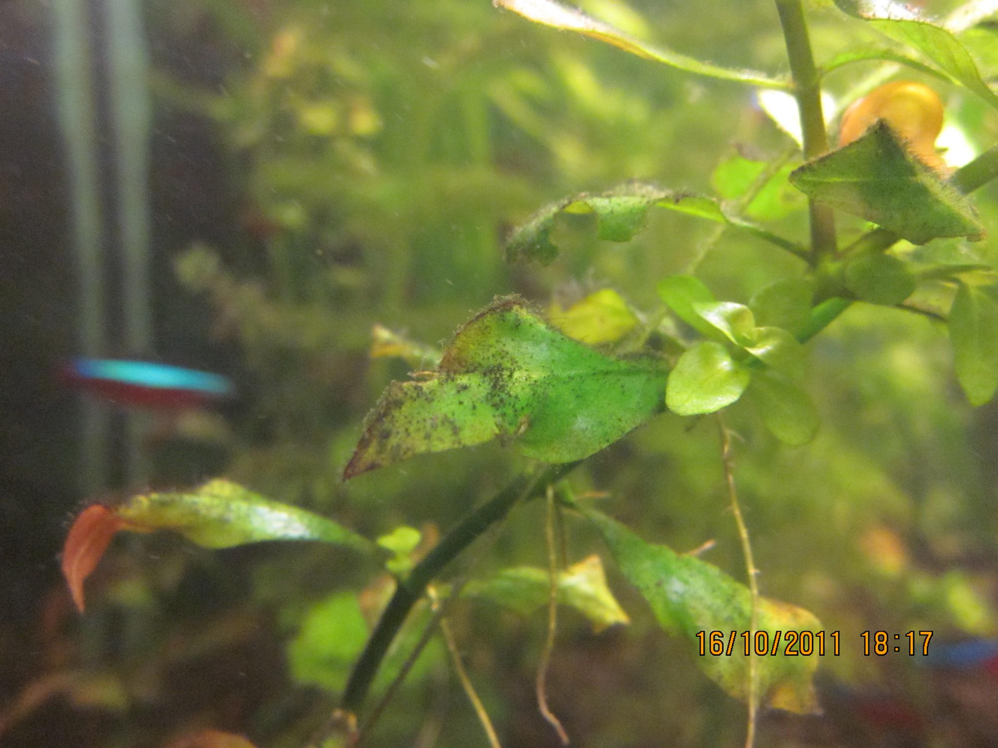 Здравствуйте! Запустил аквариум 220 литров правда без рыб, плавает две криветки (жду потомства), Посадил растения, под корешки положил кусочки торфа а в воду добавил тетра планта мин - удобрение для роста растений ( только добавил значительно меньше чем в инструкции) , самодельная балонная установка СО2 работает днём, на ночь выключаю. Освещался аквариум от двух люминисцентных ламп по 30 вт ( одна осрам флора, другая электрум) световой день 10 часов. Спустя две недели старые листочки эхинодоруса обросли водорослями. Вот растение первый день  Спусте две недели на листочках много-много ниточек как пушок покрывают листья, длинна ниточек достигает 10 мм, цвет тёмный  Подскажите пожалуйста, что спровоцировало рост водорослей? Что мне делать?