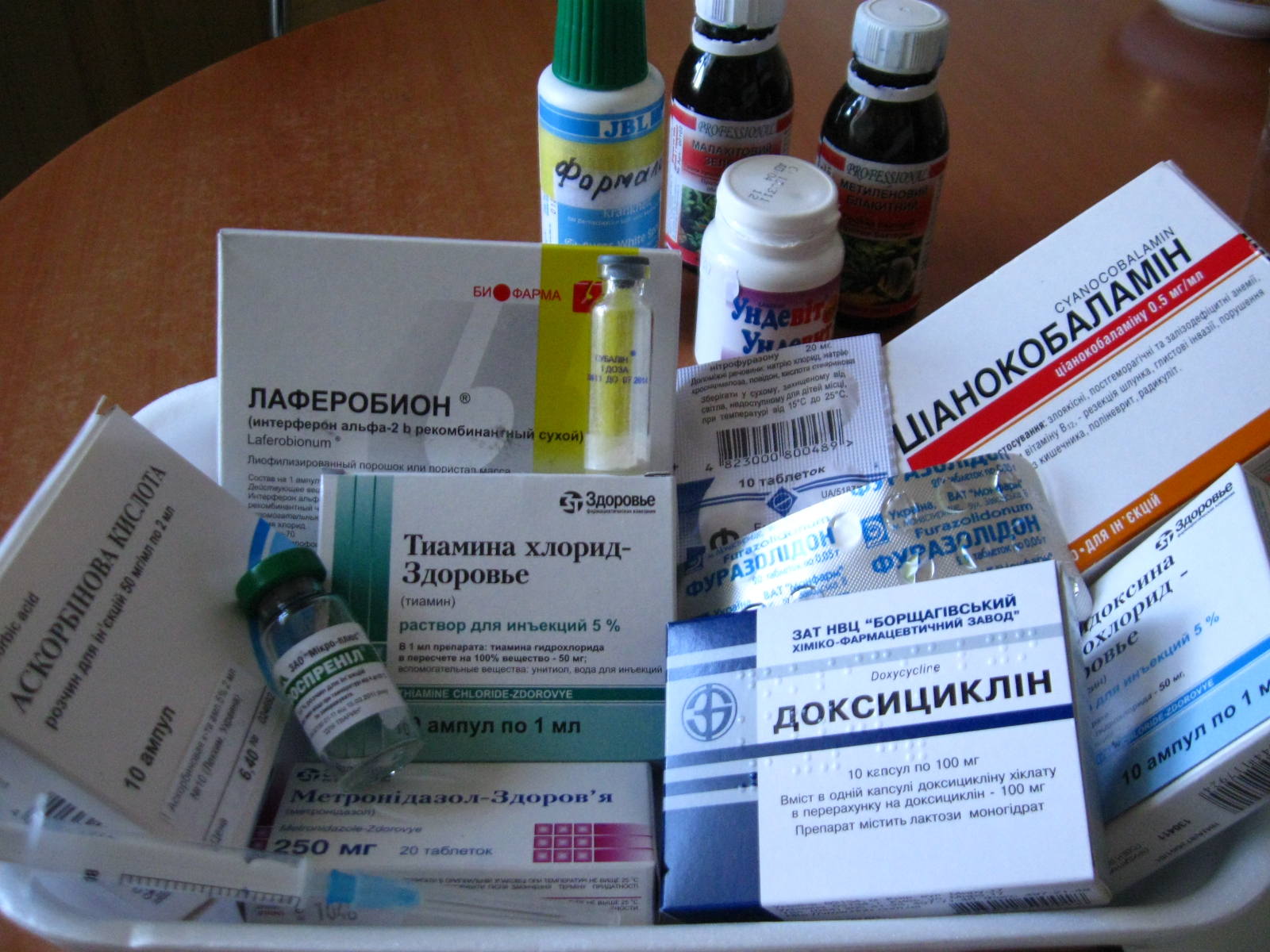 Препараты, используемые во время лечения. В чашке мотыль после обработки марганцовкой и пропитан вит.С, метронидазолом и пробиотиком "Субалин"
