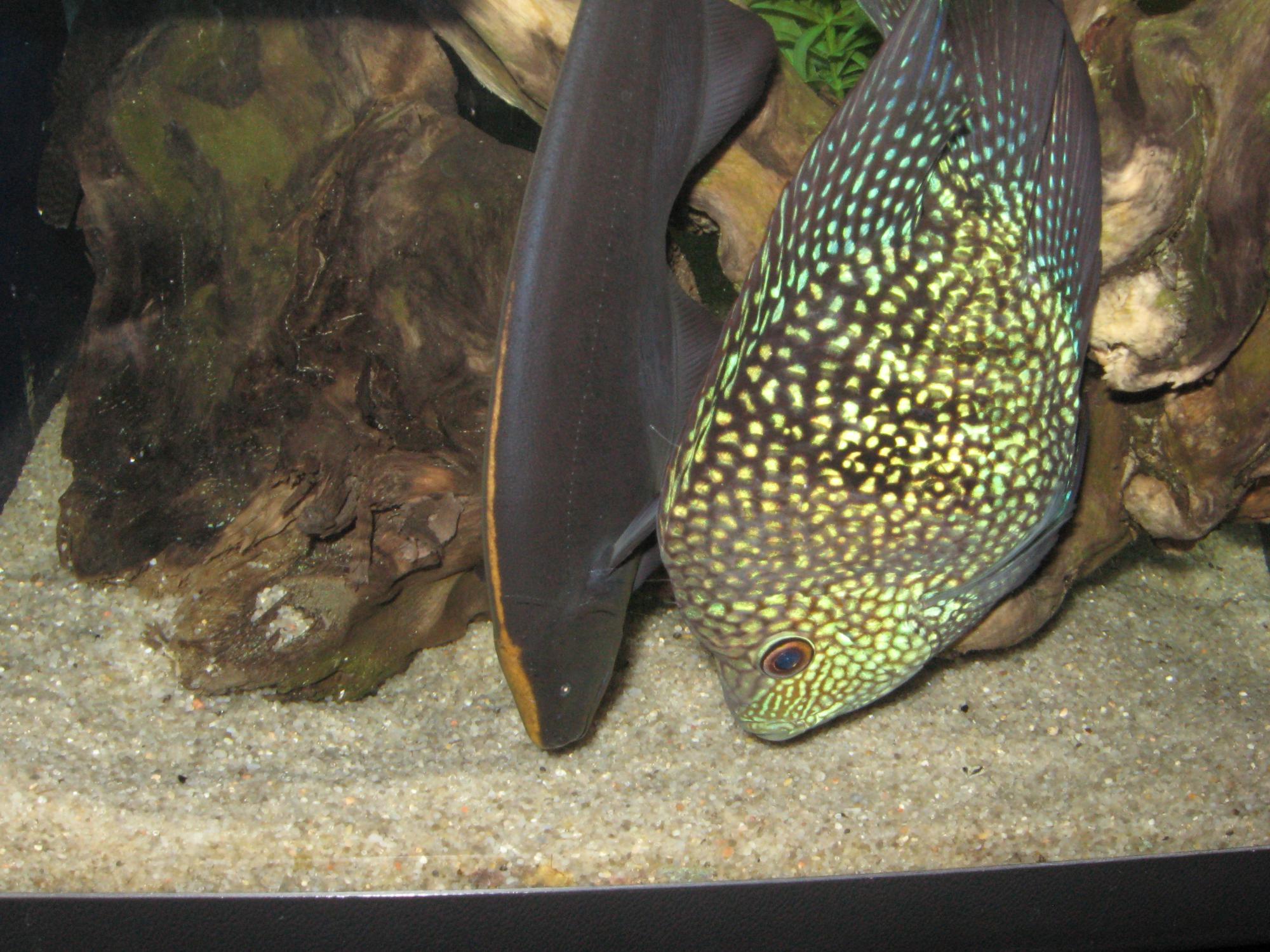 Ножей вообще ни кто не трогает. Когда брюлль заплывает в укрытие к ножу нож его еще носом в бока тычет (мол иди отсюда). Было пару раз видел когда астронотусы самки мой икру отложили так когда нож рядом проплывал пытались его за хвост дернуть от кладки отогнать и то все бес толку нож успевал отплывать.