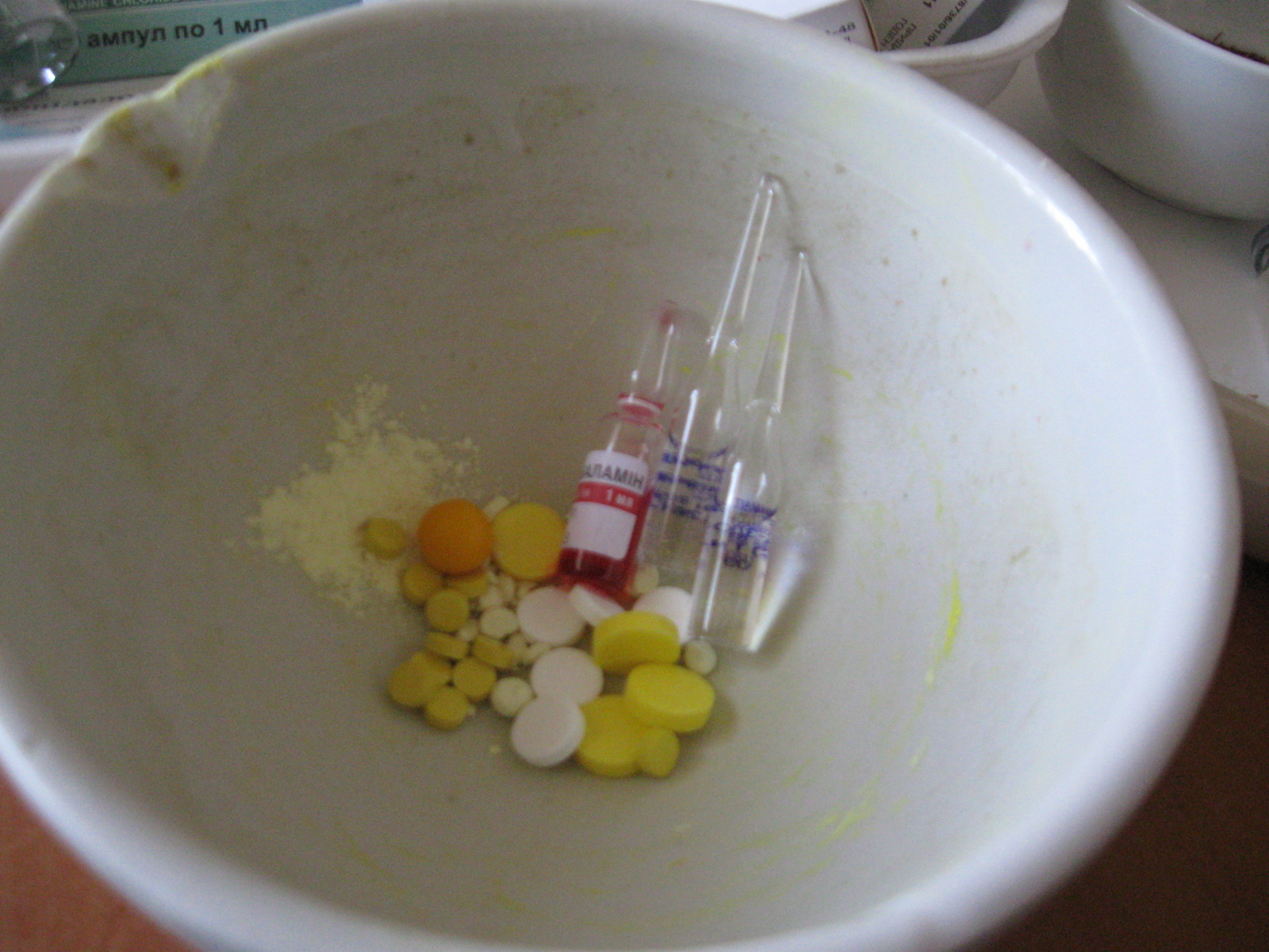 Препараты, используемые во время лечения. В чашке мотыль после обработки марганцовкой и пропитан вит.С, метронидазолом и пробиотиком "Субалин"