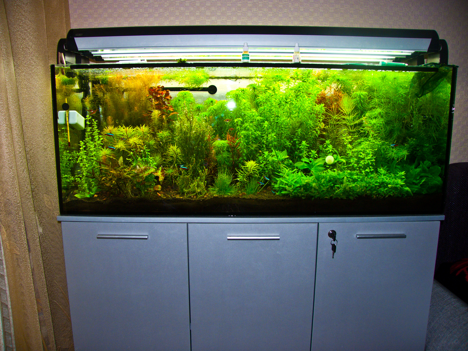 4) освещение -светильники Хаген, до этого имел крышку с лампами Т5, отражателями и эпра ЭЛТ- вывод имея аналогичную сумарнную мощность 1,1Вт на литр, сейчас мне кажется что минимум 30 а то 50% больше света получаюют растения, я думаю это из-за фирменных ЭПРА и хорошего отражателя устанновленных в светильнике.