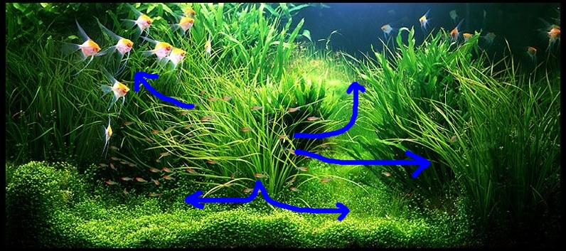 Амано грамотно поместил вторичные фокальные точки, которые увлекают внимание зрителя вокруг аквариума без использования густых зарослей или камней. Если посмотреть на поток в в этом акваскэйпе, то мы заметим, что он строго определён вторичными фокальными точками. Они специально помещены (или терпеливо ждут возврата внимания от созерцания рыб!) в стратегических направлениях, вокруг аквариума.