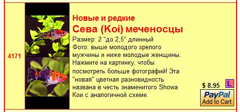 Вечная диллема между разводчиками и покупателями - сколько должен стоить , скажем, один меченосец ? Сноски из штатовского сайта по продаже рыбы. Внизу справа - цена . Взрослая рыба значительно дороже /3-е фото - внизу/. Хотя , справедливости ради , можно сказать о разнице в уровне жизни , и наверное зарплате . Мой дедушка , разводивший меченосцев говорил : ...Один хороший меченосец должен стоить , как одна селедка .
