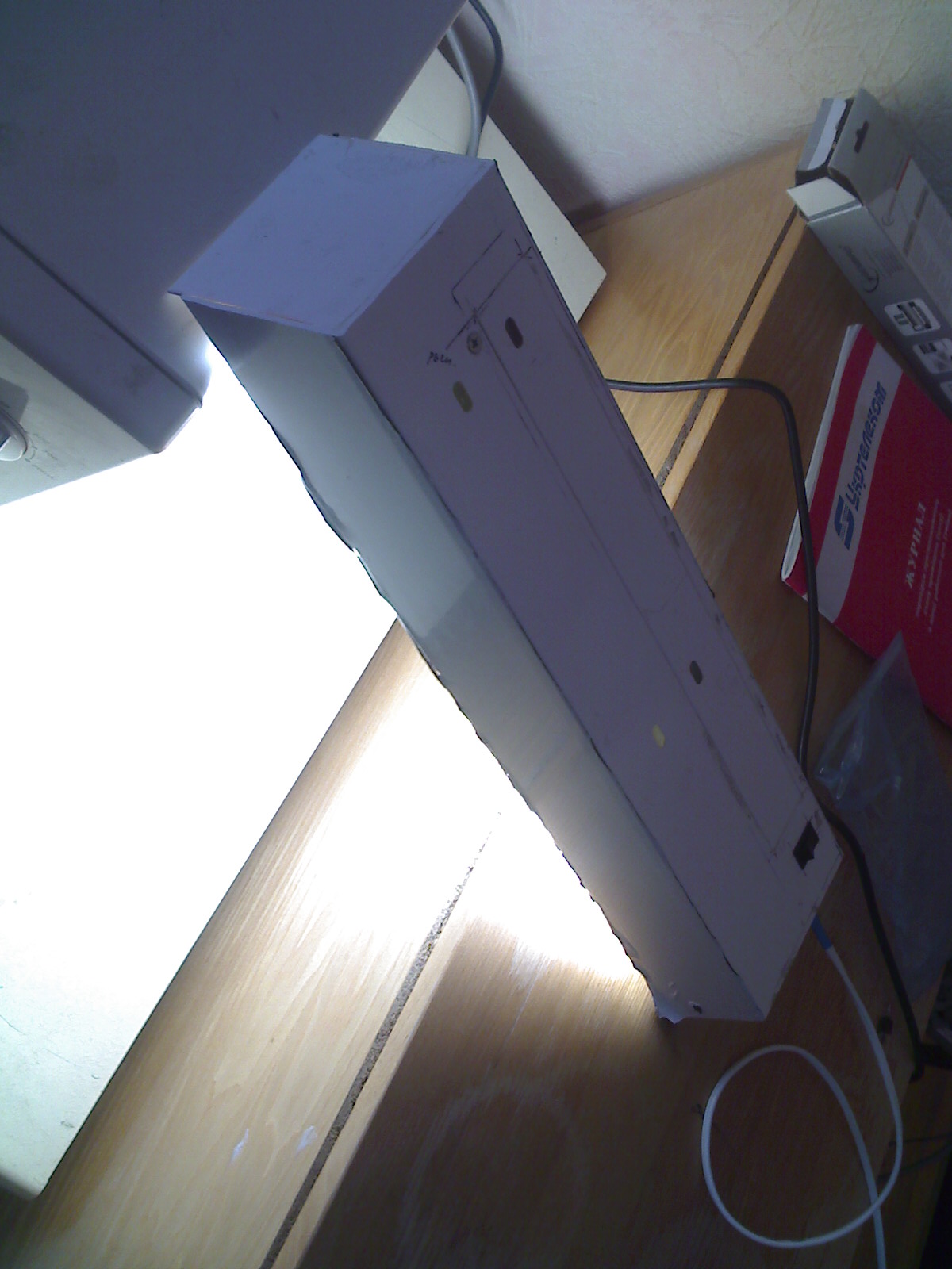 7, 8 и 9 фотки -- это финальный прогон балки на иммитаторе аквариума (стол с одной стороны и микроволновка с другой), с целью выявления глюков. Глюки, ттт, отсутствуют ))) Отражатель равномерно распределяет тепло от лампы на всю длину балки, в следствии чего балка реально остается чуть теплой. ЭПРА едва теплый даже при закрытой детали Ы.
