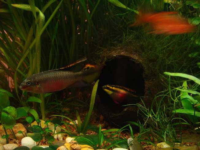 У меня живет один самец апистограммы какаду, апистограмма электрик блю неон тоже к сожалению один, в отдельной квартире живет пара хромисов