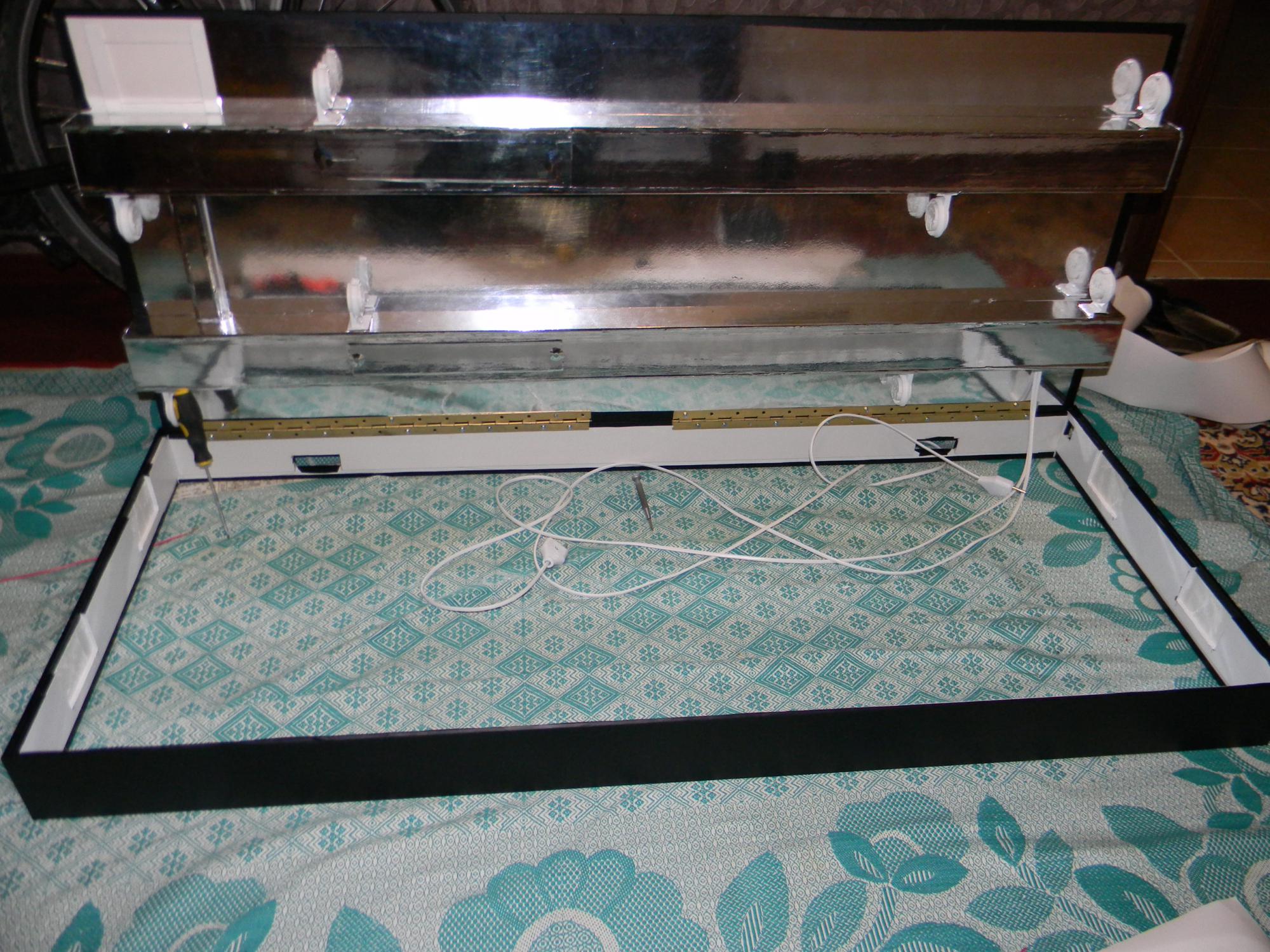 Размеры 120*50см. Двойные стенки основы крышки толщиной 1 см. Герметичные патроны под лампы, размещены в короба которые промазаны силиконом изнутри.