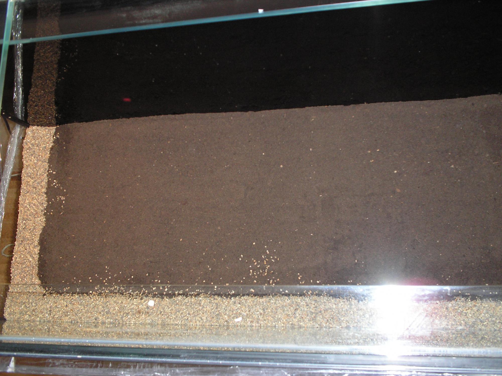 поверх земли- кварц (3 мм), покупал через форум, из Севастополя. Его на приведенной фотке видно, он по бокам. Свет 2Х 54Вт, парабол. отражатели, СО2 -нет. В личном профиле описано подробно.