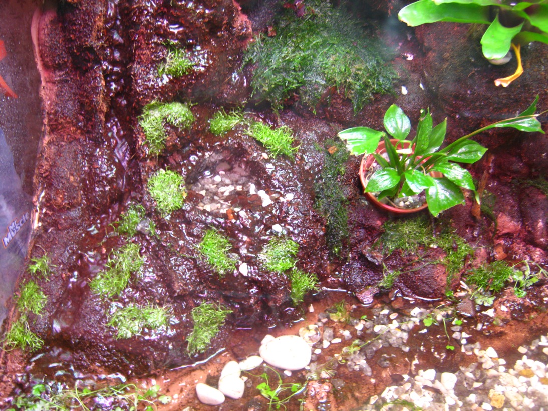 Ну и последний фрагмент-это оформление палюдариума. Фон будет из пены+силикон+кокосовая стружка, также будет 2 коряги, которые будут выступать в качестве эпифитных деревьев с бомелевыми. У берега будет лежать галька а затем кварцевый песок или гравий. Почти весь водопад будет заросшим мхом, а у низа и берега будет рости стаурогин и солейролия. В горшках ростет криптанус, папоротник и спатифилум, возможно чтото вьющееся будет. В вобе будет анубиас и криптокарина.