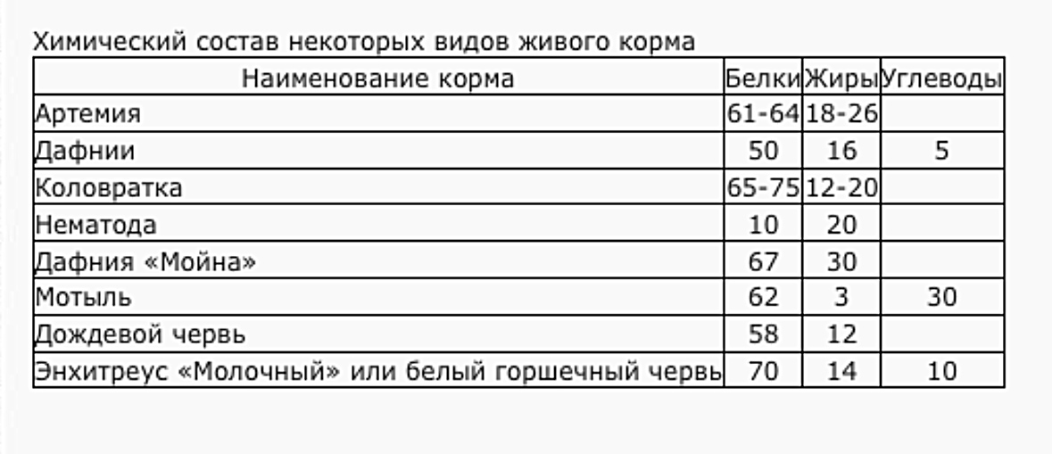 Нашла в сети информацию по химсоставу некоторых живых кормов