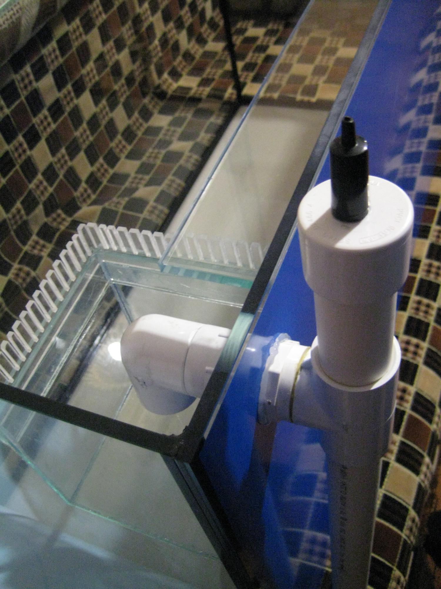 первая проблема с которой я столкнулся это баланс воды. А моем малом аквариуме стоит стеклянный перелив делал я его сам и честно говоря очень доволен результатом. По итогу когда в нем испаряется вода то уровень воды везде остается прежний, кроме отсека где стоит возвратная помпа. там же я разместил и авто долив. и все работает как часы. А вот в новой банке в ходе наблюдения заметил что в последнем отсеке объем практически не меняется. И так выставил я уровень в аквариуме затем с помощью регулировки крана на сливной трубе настроил уровень воды в стакане так что он совпадает со скоростью возвратной помпы. итог ( все работает нормально шума не где нет но есть одно но!!!) когда вода испаряется из аквариума естественно что уровень в аквариуме падает а это значит что и в сливной стакан попадает меньше воды. В следствии падения уровня в стакане он доходит до его носика и начинает подсасывать воздух в сливную трубу и только потом в уровень в отсеке где находиться возвратная помпа начинает понижаться