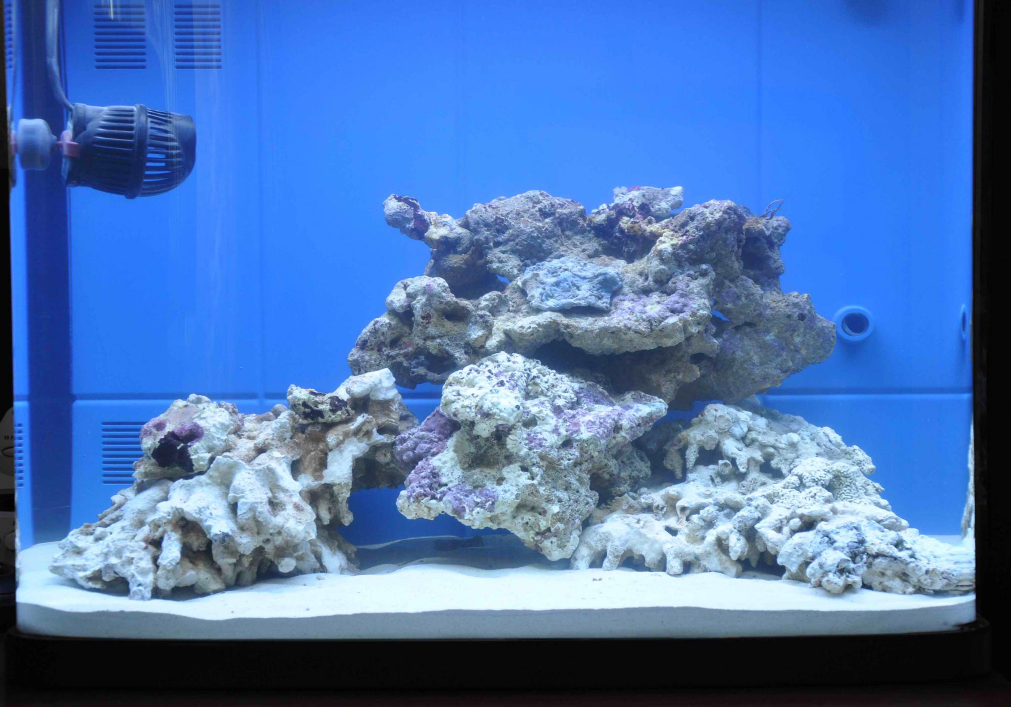Ну если посмотреть на рифовые камни в море, то видно, что они не просто пористые ( в мелкую дырочку ), а имеют либо вид булыжника либо с большим количеством сквозных крупных отверстий и приливно-отливная вода омывает такие камни со всех сторон. А на фото видим камни в виде тарелки которую положили на песок вверх дном. Вот это "дно" и предлагаю по сверлить насквозь. Камень должен омываться течением со всех сторон.