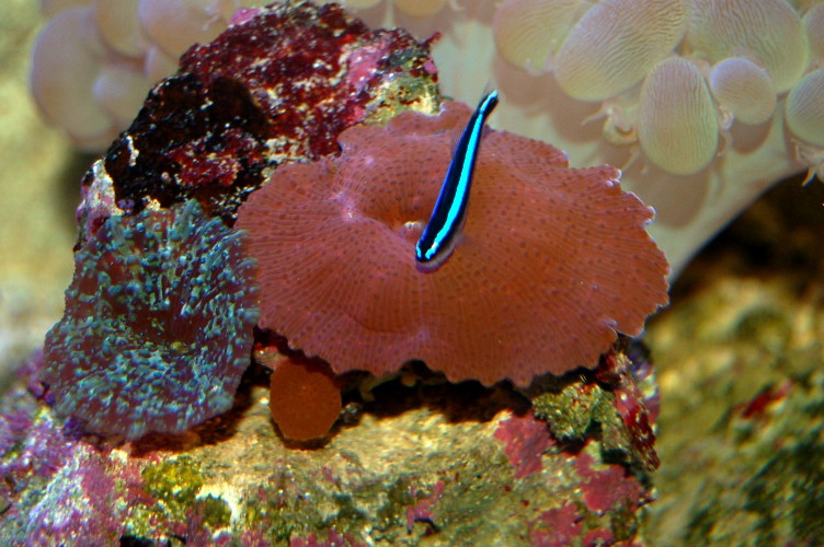 Ну насчет 20 литров как-то сомнительно для такой рыбы, места то ей хватит, но она все равно растет не слишком мелкая, за счет чего поддерживать? Частые подмены разве что. Я бы подумал тогда лучше о бычках - гобиодоны хистрио либо желтые. Хистрио 2 шт. у меня живут в той же системе уже год. Сначала тоже в водорослевике, где были скучными, теперь в общем, что куда интереснее. Один поселился в длиннополиповом сарке - умора наблюдать, как он елозит между полипов и охраняет, не хуже клоунов. Второго стал видеть реже, прячется между камнями. Еще обалденный бычок -гобиозома оцеанопс, тоже бы всячески рекомендовал. К сожалению, своего потерял, когда разбирал камни, был где-то в дыре. Очень живая рыбка и несмотря на размер, очень привлекает внимание. Тоже тяготеет сидеть на грибах и кораллах, чистит рыбу и ко всему прочему американцы их разводят. Хотя сложно сказать, насколько интересным он будет в маленьком объеме, но в общем аквариуме весьма! Пара старых фот.