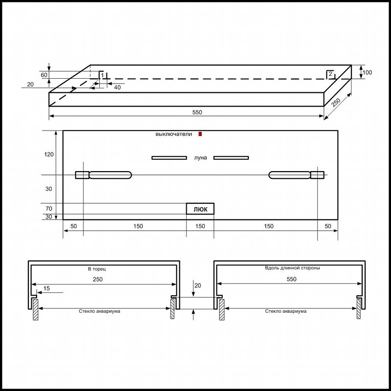 Крышка 4х39 Вт Т5, аквариум стоит торцом к стене, поэтому реализовано симметричное открытие обоих половинок крышки.