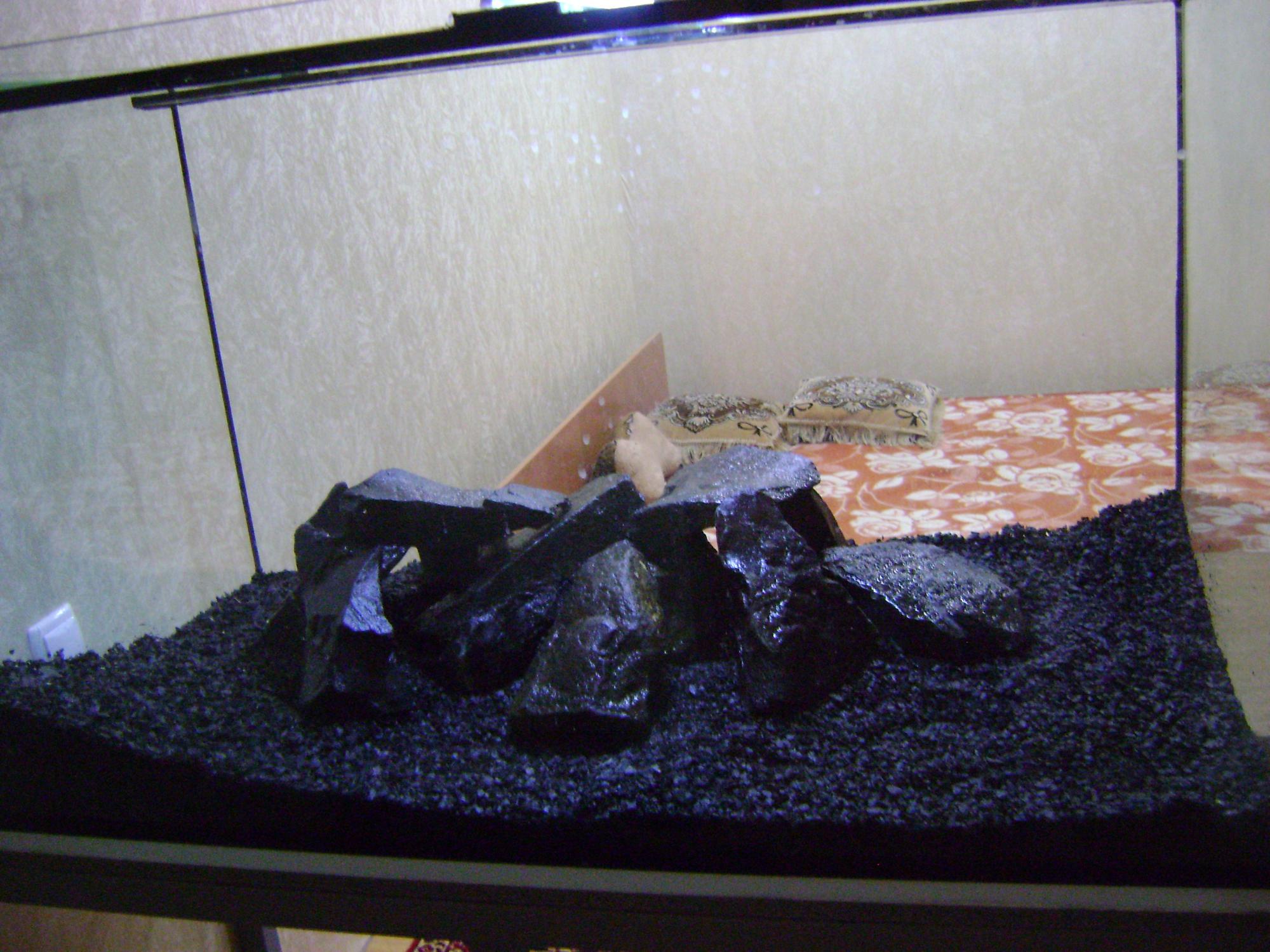 Всем доброго здоровья!!Нужен совет по оформлению цихлидника для малави.Итак что есть:аквариум110*55*65(выс),просматривается с 3-ёх сторон(2дл. и торец).Также есть уже проимерно 35кг грунта(базальт чёрный 3-5мм) и 30 кг того же базальта,но покрупнее  Освещение будет 2*30 Хаген Аква-и Пауэр-Гло.Собственно вопрос-добавить ещё камней или так нормально(см фото-качество фото не очень т.к аквас ещё пока без воды)если добавить камней.то каких?Я думал может туф(белый с гротами) или с базальтом он будет не очень?Вобщем буду рад любой критике