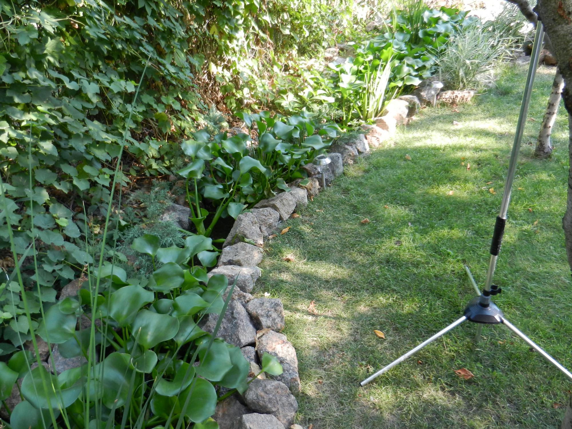 К лежакам отдельно пришлось купить матрасики, выбор был не велик, Получились цветастые, немного гармонируют с кои в пруду. Также в Эпицентре обратил внимание на садовые светильники на солнечных батареях (пр-во Китай). Упаковка таких светильников (там их 5шт) стоит 89 грн. Дешевле грибов. Купил 3уп, порастыкивал их в нужных местах. Теперь ночью особая атмосфера, романтика. Также пришла идея, что такие светильники можно использовать, чтобы освещать гладь воды, т.е. устанавливать их прямо в пруд (на мелководье), только нужно продумать грузило-опору на ножку светильника (по принципу опоры для зонта от солнца). Или можно поступить еще проще, вставив светильник в крупный/тяжелый горшок с болотниками или нимфеями. Т.е. варианты могут быть разные. Не уверен, насколько это актуально в плане эстетики, но если не понравится, то светильник всегда можно легко и быстро убрать, т.к. нет проводов и т.п.