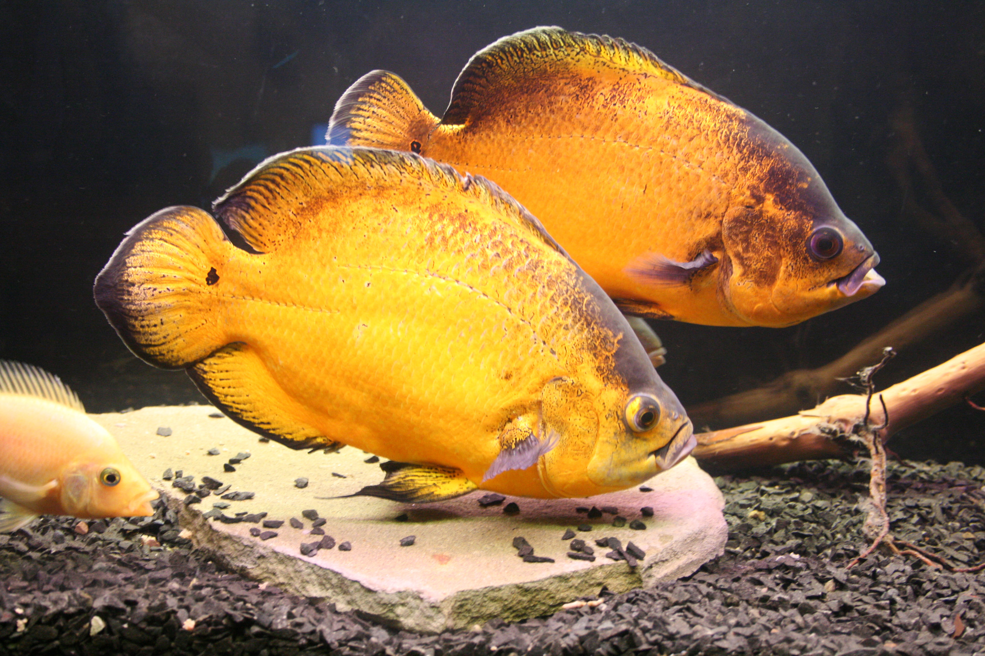 Зашел я в свой зоомагазин , разговорился с менегером и она мне поведала что у них остался один 25см тигровый Оскар которого постоянно донимает Тилапия меньше его в три раза. Предложила мне его спасти, посмотрел я на него бедного, сердце кровью начало обливаться и забрал его. Менегер отдала его за копеечные $10. Принес домой, посадил к недавнему Оскару, очень интересное поведение у меньшего. Он нового с открытым ртом начинает толкать в бок. Меньшего окрас стал ярко оранжевый, плавники тоже и у нового цвет стал яркий. Мелкий то толкает то рядом плывет. Большой на маленького ноль внимания. На второй фотке видно как он толкает большого. Что это?