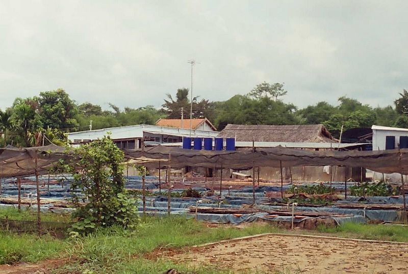 Есть на этой разводне и 2 больших пленочных пруда (вот здесь лежит пленка) с сетчатыми садками. Между 2-мя рабочими навесами вдалеке проложена труба прямого слива в один из притоков р. Сайгон, протекающий за забором.