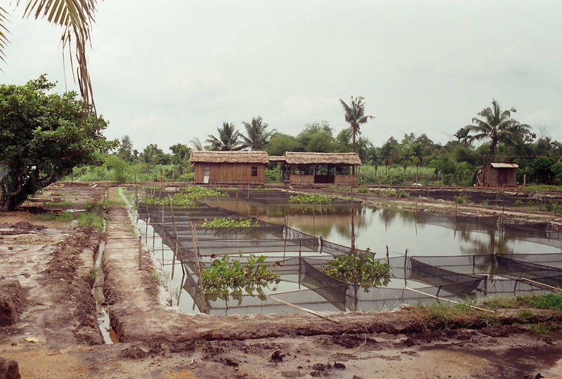 Это вьетнамская рыборазводня. Изображенные здесь на фотографиях бассейны имеют площадь 2,5х2,5м при полу-метровой глубине. Они расположены рядами, 2 соседних бассейна в ряду имеют общий бруствер. Между рядами есть узкие проходы, вдоль которых проложены трубы подачи воды с вертикальными стояками с кранами для заполнения бассейнов. Сделаны они достаточно просто. Вся вынутая земля уложена в брустверы, а внутри яма выстелена прорезиненной тканью (типа брезента). Это не пленка. Такое покрытие не требует подложки из геотекстиля. Я подозреваю, что здесь были использованы какие-то стандартные тенты, потому что они подвернуты по краям и имеют в углах кольца под веревки, как тенты для автомобильных прицепов. Каждая ячейка выстелена отдельным "тентом", так что если надо слить воду, то 2 человека просто берут за край тента и тянут, выливая воду при этом в проход между рядами. Может это несколько не гигиенично (в желобе между рядами жидкое месиво), зато дешево, надежно и практично. Ходить можно по выстеленному пленкой брустверу.