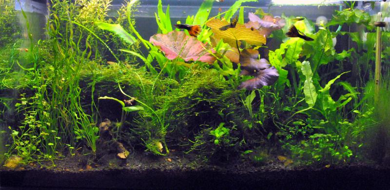 Аквариум выдержал два редизайна, один переезд по комнате, и готовится к следующему... Все на месте - ничего не развалилось, не лопнуло, не перевернулось...  Конечно, как и у всякого аквариума есть свои достоинства и недостатки, а у кого их нет?  Живем помаленьку...