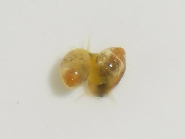 Пока я себе к микрорасборе галактике и ред кристалам  подселил теодоксов и ещё какая-то случайно попала, выросла уже, лазит как бы по поверхности воды с обратной стороны (вверх тормашками) при чём довольно быстро. И что-то собирает с поверхности. Думаю ничего злого она не сделает, пока не трогаю её.