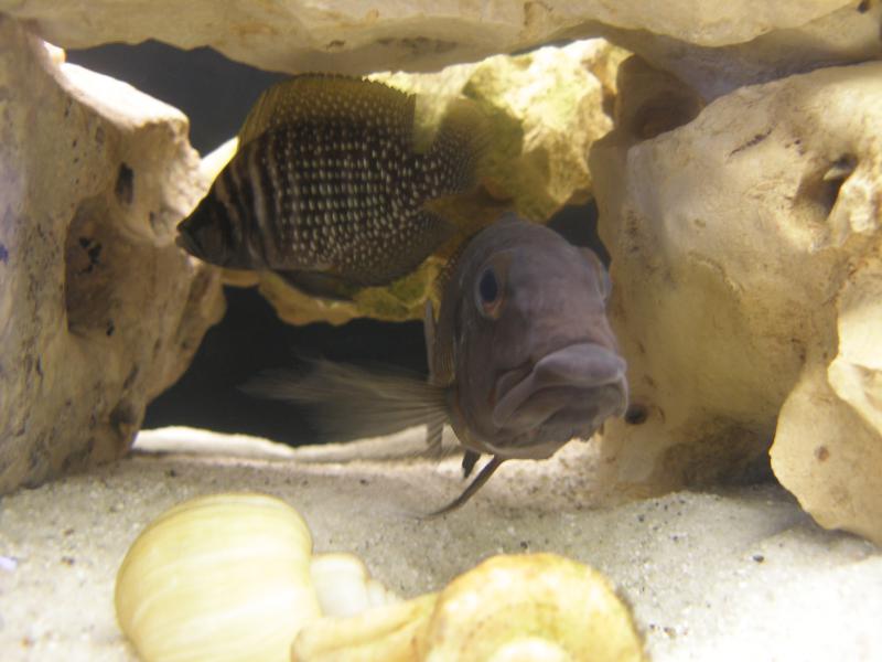 Благодаря ракушкам у входа в грот, самец Алунокрануса нашёл новое место для строительства кратера.Сейчас Гнатохромисы периодически заплывают в пещеру,правда ракушки тоже заберу и положу камень вместо них а то Кальвус облюбовал место над рапаном и создаёт маленький дискомфорт.