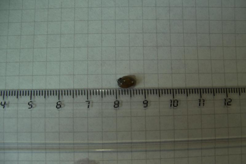 Вот такое выловил у себя, размер 4-5 мм, серенькое (на фото баланс не могу скорректировать). Похоже на теодокус, но неуверен.