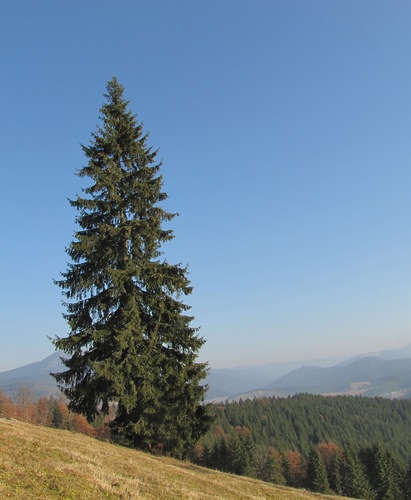Карпатская ель она же смерека, рост её молодых ветвей в горизонтальной плоскости, потом под тяжестью опускаются под уголм в сторону земли вроде так я видел эти деревья когда был в комантировке во Львове. Если ошибаюсь пусть поправят меня колеги з Західної України.