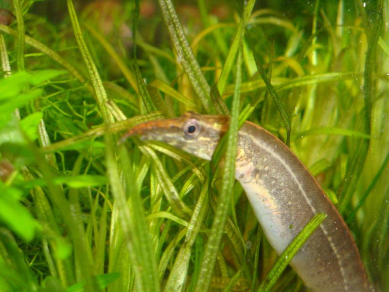 живут в 110 литрах и в каменистом грунте - не закапываются, не получается - им уже пол года. Копошатся в грунте в поисках упавшего корма и вообще очень эффектно смотрятся в акве. Тёща когда я купил их на рынке говрила "Что за червяков притащил.", а сейчас беспокоится - я сказал, что макрогнаты не едят сухой корм - "Ты комариков (это на их так ласково называет) покормил заморозкой?" Они теперь её любимцы - конечно около 20 см с великолепными хвостами. Они эффектно выплывают из зарослей, проплывают возле переднего стекла и снова скрываются в заросли. А мордочка - с кем только не сравнивали - и комарик, и лошадка.