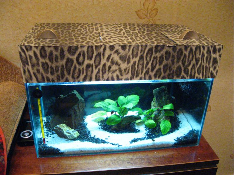 1)Аквариум-кубик 20х20х20 (8л.) + фильтр + термометр + крышка со светом (патрон под лампочку с цоколем Е14) + пленка которой обклеена крышка.