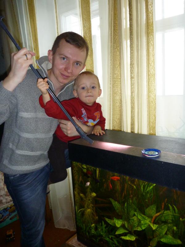 Дочке тогда было чуть больше года. Папа, конечно, купил аквариум, начитался литературы, чегой-то сваял  Но и доця от своих аквариумистских пристрастий отказываться не собиралась. Как только она стала устойчиво стоять на ногах, сразу начала рыбок кормить