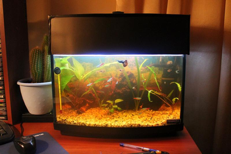 Я на днях сделал на свой 40л такую же крышку, только у меня не овал а впереди три грани. ПВХ 5мм. углы склеял пластиковым уголком. И лампы поставил такиеже))))). Т5, 8W. только у меня их 4 шт. Три стандартных простых (5000-6500К) и одна Hagen Aqua-Glo 8W. Еще! конструкция ламп позволяет их подключить все (8шт по паспорту) последовательно, на одну вилку, там переходник даже в комплекте идет. И включатели я не ставил, а сразу купил таймер для света. Если интересует пример, могу скинуть фото.