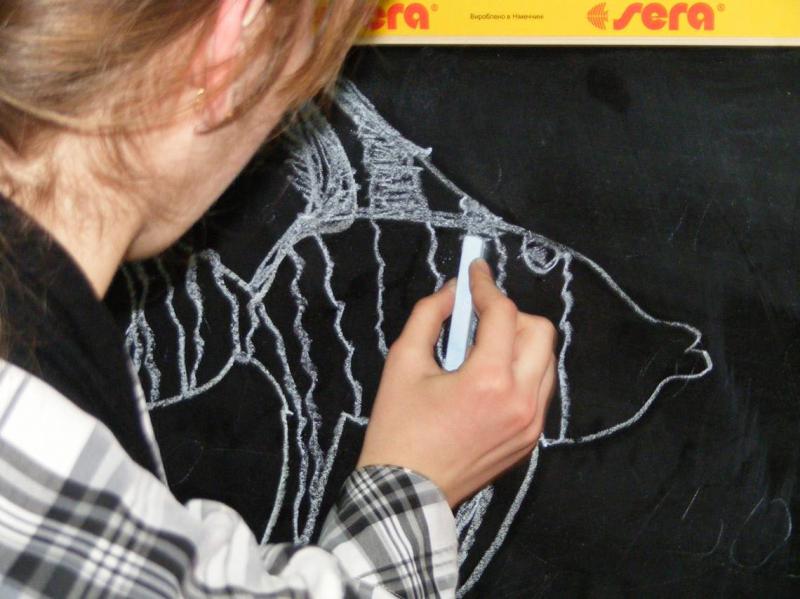 Кратко о самом конкурсе . Из групп поддержки , которые пришли поддержать свои команды-конкурсанты на крнкурсе по оформлению аквариумов , были путём опроса на аквариумную тематику отобраны команды по 5 человек с каждой стороны . Задача команд-нарисовать аквариумную рыбку . Условие-каждый участник может подойти к мольберту только один раз и рисовать до тех пор,пока не оторвёт руку от мольберта . Как только рука от мольберта оторвана , его сменяет другой участник команды и продолжает неотрывая руки рисовать . И таким образом до последнего участника .